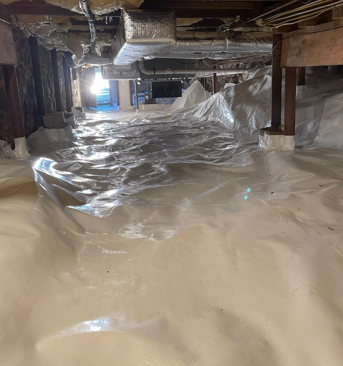 Owners in New Castle, ME reached out to TC Hafford Basement Systems for help with their crawl space. The crawl space had a lot of ledge, as well as constant water intrusion issues. We installed our two-step encapsulation system, including CleanSpace vapor barrier and drainage matting. The CleanSpace liner is an inorganic material so it prevents mold growth, as well as seals out moisture. Drainage matting is installed underneath the liner to control and divert ground water.