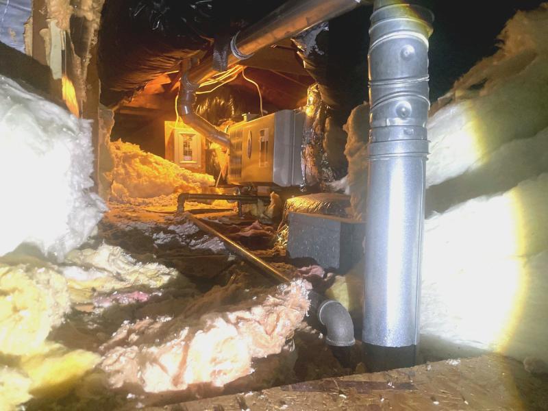 The before picture shows less than 6" of fiberglass insulation, deteriorated ductwork and insulation voids on a large kneewall.