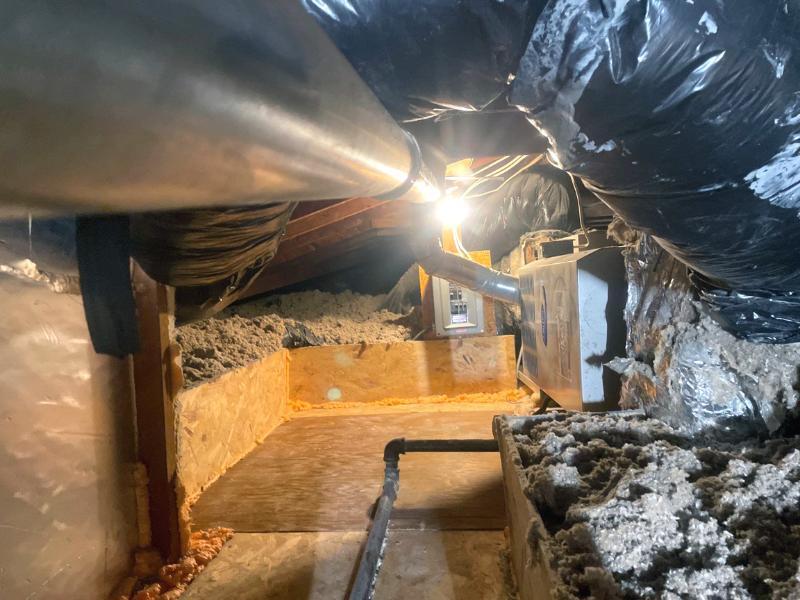 This customers energy bills were cut in half by a crawlspace encapsulation and airseal and insulation in the attic. This crawlspace already had a thin plastic liner that was only blanketing the dirt where it was not torn. Installing the Clean Space Liner sealed off all the dirt and moisture from the ground protecting the bottom of your home from outside air and moisture build up. Spray foaming the outside walls ensured the aread would stay insulated and keep the floors comfortable.