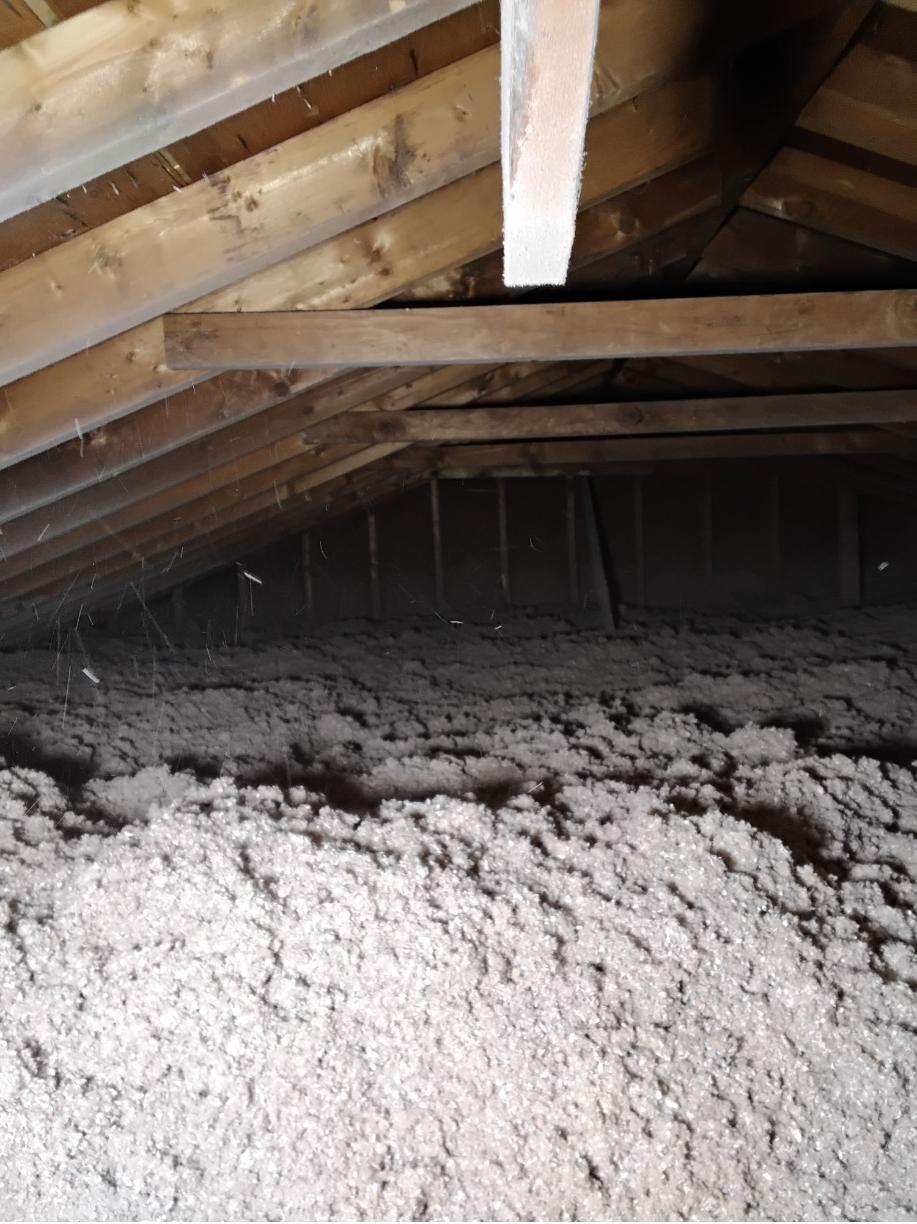 This home's attic did not have high enough R-Value to protect against outside air infiltration. The old, rolled fiberglass only provided an R-Value of around R20. R-Value below R30 will not work effectively enough to resist unwanted air flow. Installers at Primary Home Improvements blew high R-Value, dense cellulose on top of the old insulation to create a more functional attic.